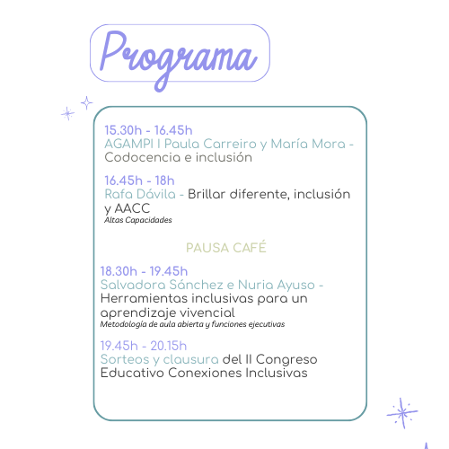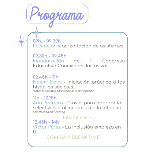 Durante tu asistencia podrás disfrutar de 3 ponencias impartidas por profesionales del ámbito educativo, donde se abordarán diferentes aspectos de la educación inclusiva, la atención a la diversidad y el acompañamiento al alumnado con necesidades específicas de apoyo educativo.